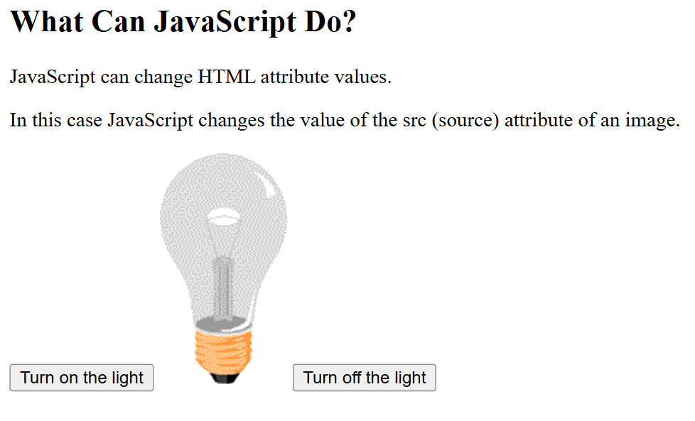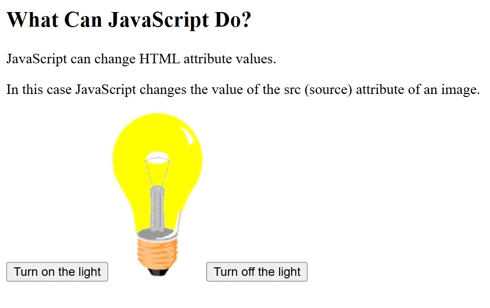 Cette page présente une ampoule et un deux button qui permet à celle-ci de s’allumé en cliquant sur le button (Turn on the light) puis de s’éteindre en cliquant sur le button (Turn off the light)