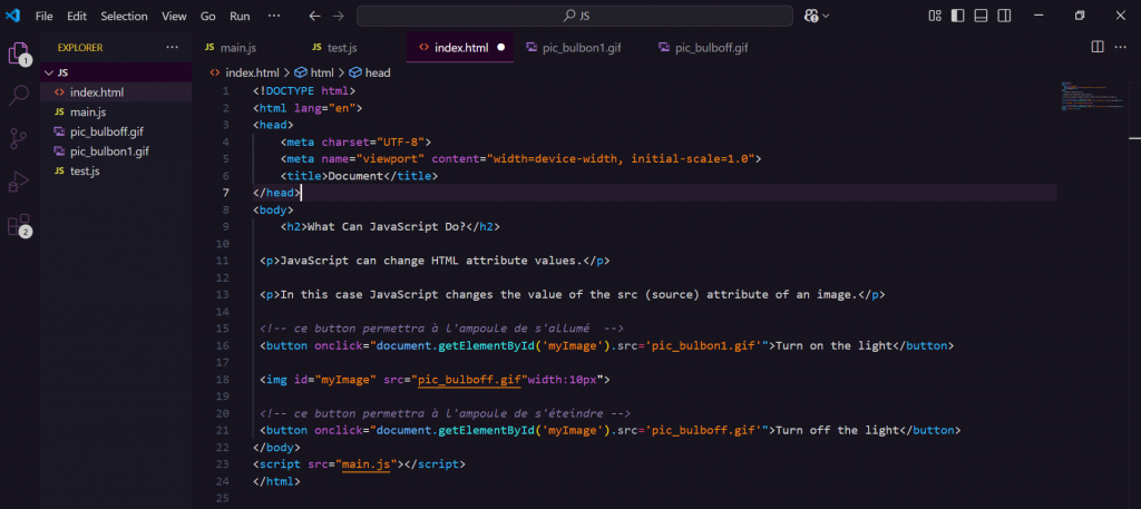 Le JavaScript est le langage le plus utiliser dans le monde du développement Web. Alors, dans son apprentissage, j’ai entrepris un petit projet fun durant mon temps libre. J’ai donner vie à une page en intégrant une animation avec une ampoule qui grâce à un clique peut s’allumé et s’éteindre. Avec du HTML et quelque ligne de JavaScript on peut faire des choses assez fun.